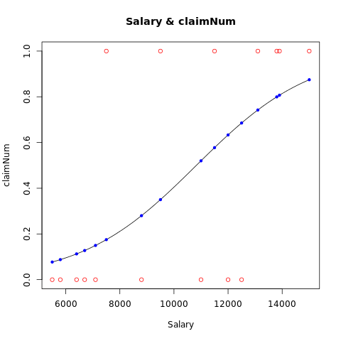 ===============Result=============== claimNum salary 1 0 5500 2 0 5800 3 0 6400 4 0 6700 5 0 7100 6 1 7500 7 0 8800 8 1 9500 9 0 11000 10 1 11500 11 0 12000 12 0 12500 13 1 13100 14 1 13800 15 1 13900 16 1 15000 ===============Model=============== Call: glm(formula = claimNum ~ salary, family = binomial, data = result) Coefficients: (Intercept) salary -5.0425584 0.0004657 Degrees of Freedom: 15 Total (i.e. Null); 14 Residual Null Deviance: 21.93 Residual Deviance: 16.05 AIC: 20.05 ===============Summary Model=============== Call: glm(formula = claimNum ~ salary, family = binomial, data = result) Deviance Residuals: Min 1Q Median 3Q Max -1.5208 -0.6299 -0.4147 0.6946 1.8668 Coefficients: Estimate Std. Error z value Pr(>|z|) (Intercept) -5.0425584 2.4936676 -2.022 0.0432 * salary 0.0004657 0.0002285 2.038 0.0415 * --- Signif. codes: 0 '***' 0.001 '**' 0.01 '*' 0.05 '.' 0.1 ' ' 1 (Dispersion parameter for binomial family taken to be 1) Null deviance: 21.930 on 15 degrees of freedom Residual deviance: 16.046 on 14 degrees of freedom AIC: 20.046 Number of Fisher Scoring iterations: 4 ===============Predict=============== 1 0.6492079